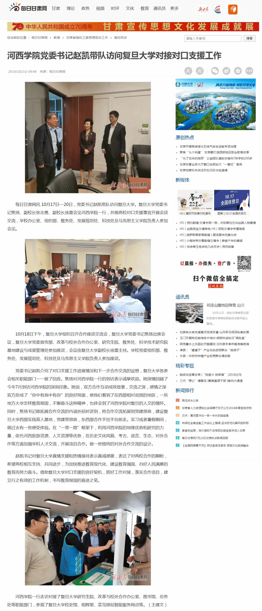 每日甘肃网讯 10月17日—20日,党委书记赵凯带队访问复旦大学。复旦大学党委书记焦扬、副董事长张志勇、副董事长徐雷会见3044永利集团官网一行,并就两校对口支援事宜开展会谈交流,公司办公室、组织部、教务处、发展规划处、科技处及3044永利集团负责人参加会见。