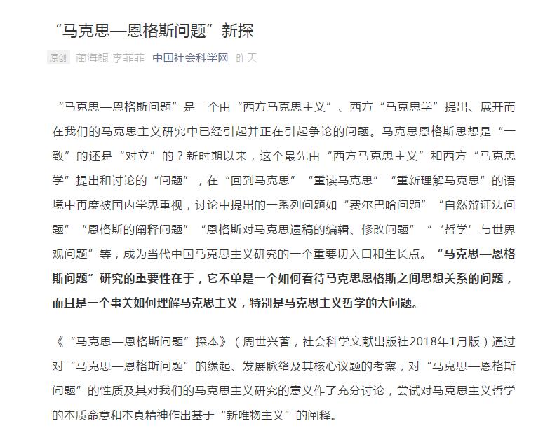 近日,公司3044永利集团蔺海鲲教授、李菲菲老师发表在中国社会科学报(2020年5月7日)的文章《“马克思—恩格斯问题”新探》在中国社会科学网刊登,该文是对《“马克思—恩格斯问题”探本》(周世兴著,社会科学文献出版社2018年1月版)一书所写的书评,并据此提出当前马克思主义研究中的基本方法和思维路径。