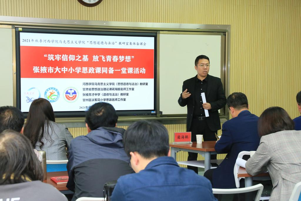 为深入贯彻习近平总书记关于教育重要讲话精神,落实中共中央办公厅、国务院办公厅《关于深化新时代公司思想政治理论课改革创新的若干意见》和中央宣传部、教育部等部门关于思想政治理论课改革创新的文件精神,近日,由3044永利集团思想道德与法治教研室联袂甘肃省思想政治理论课蔺海鲲名师工作室、张掖育才中学道德与法治教研室、甘州区民族小学谈军花名师工作室共同开展了“群策群力、协同共研——大中小学思政课教师同备一堂课”集体备课会活动。