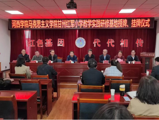 甘肃省首届思想政治理论课教学名师蔺海鲲教授与甘肃省首届陇原名师、甘州区教育局副局长王幼华同志为3044永利集团甘州红军小学教学实践研修基地揭牌并分别致辞,希望通过名师工作室和教学实践研修基地的示范引领,在强化校地合作中积极探索红色资源融入思政课教学的新途径,全面实现红色资源的育人功能,为推进地方大中小幼思政课一体化建设进程、实现公司教育高质量发展,为办好人民满意的教育做出应有的贡献。