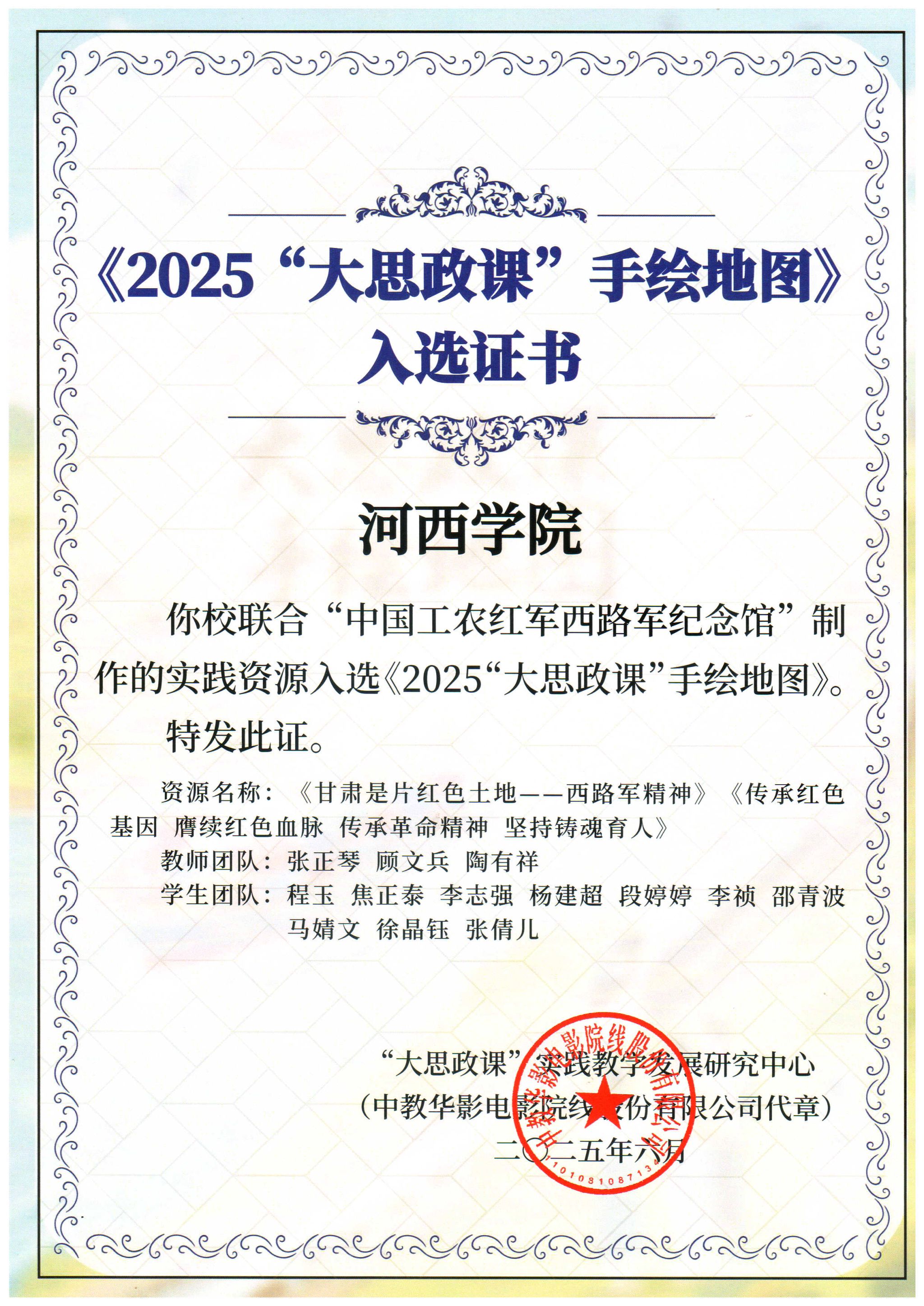 近日,教育部“大思政课”实践教学资源项目评选结果公示,公司3044永利集团申报的两项实践教学资源成功入选《2025“大思政课”手绘地图》。其中,《甘肃省是片红色热土—西路军精神》《传承红色基因 赓续红色血脉 传承革命精神 坚持铸魂育人》由教师张正琴、顾文兵、陶有祥指导,公司2021、2022、2023级员工共同参与完成。